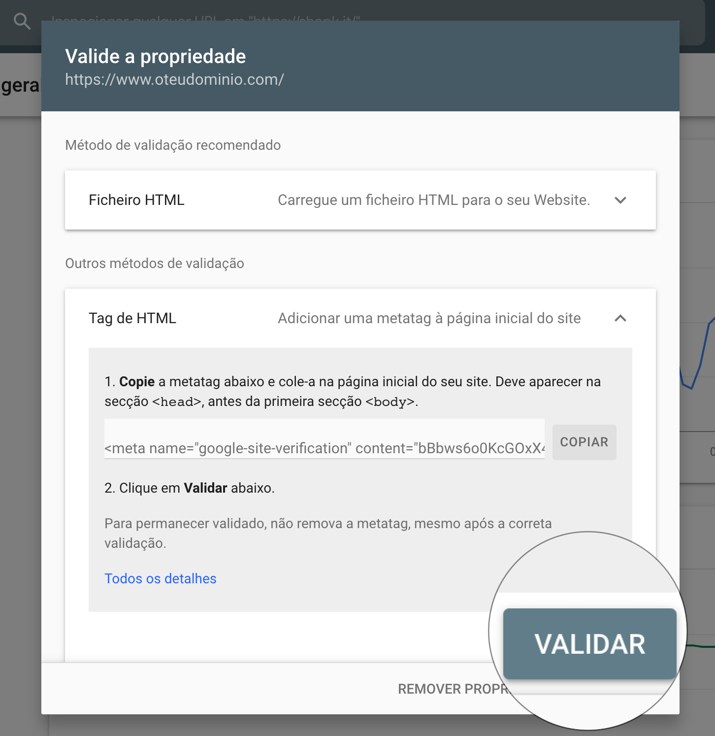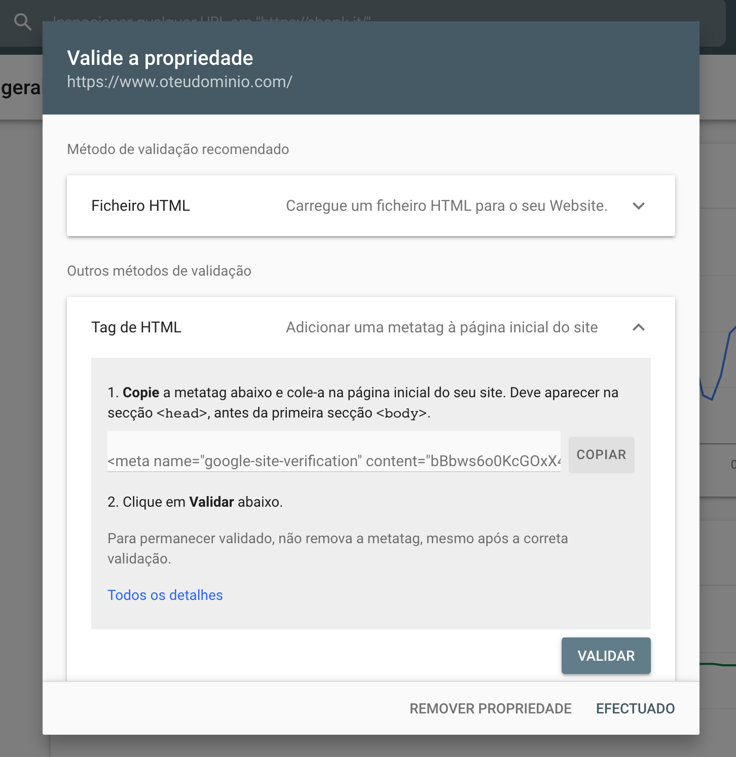 Depois de introduzir o URL, clique em Continuar. De seguida, surgirá uma janela com vários métodos de validação da propriedade. Deve optar pelo método de validação Tag de HTML e clicar para ver mais detalhes.