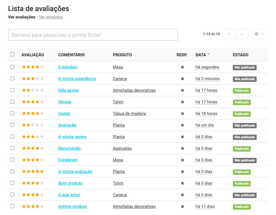 Quando começar a receber avaliações, pode geri-las na própria app e escolher se pretende publicar, cancelar ou eliminar cada avaliação. Também pode alterar a vista das avaliações dentro da app ao optar por selecionar as colunas das avaliações ou dos produtos, assim como, pesquisar por avaliações específicas.