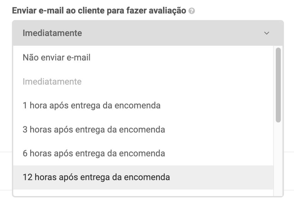 Deve definir se pretende que seja ou não enviado um email ao cliente, para que este possa efetuar a avaliação do(s) produto(s) que encomendou. Pode igualmente definir quando o mesmo é enviado.