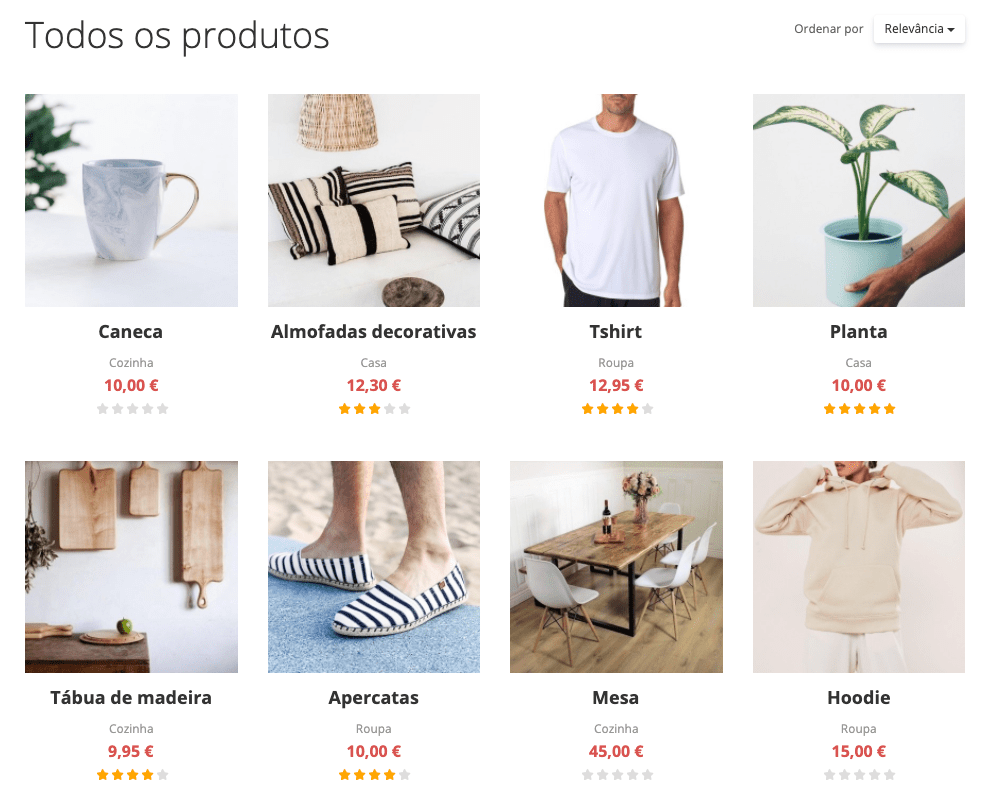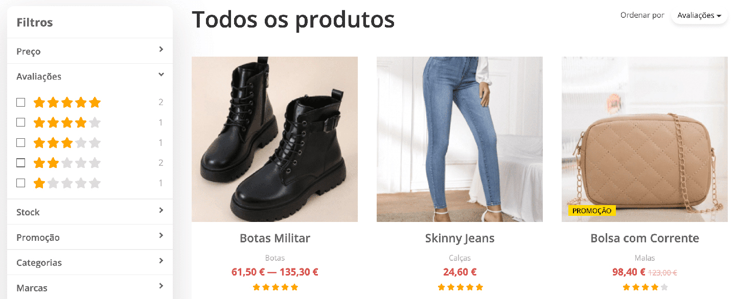 Quando ativa a app Avaliação de produtos, fica disponível uma nova opção de ordenação de produtos nas páginas com listagens de produtos, como é exemplo a página Todos os produtos. Com recurso ao Editor de Templates, no menu Aparência, em Definições gerais > Listagem de produtos > Critério de ordenação, pode definir por defeito a ordenação das listagens de produtos por avaliações. Desta forma, os produtos com avaliações surgem em primeiro lugar nas listagens.