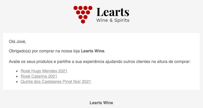 Após a encomenda passar ao estado Entregue, é enviado um email ao cliente a agradecer a recente compra e a indicar que se efetuar a avaliação, receberá uma oferta. Após o cliente realizar a avaliação do produto, receberá um segundo email com o código do cupão como agradecimento.
