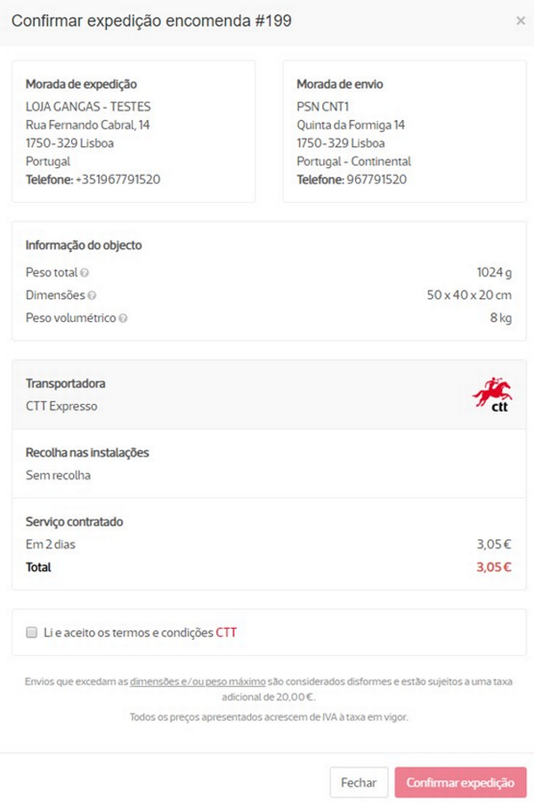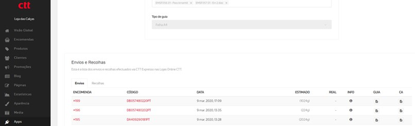 Após a confirmação, é gerada uma guia de envio, um certificado de aceitação e um número de recolha caso selecione essa opção. Todos os documento serão enviados para o seu e-mail e e podem ser consultados no menu Apps / Expedição / CTT Expresso.