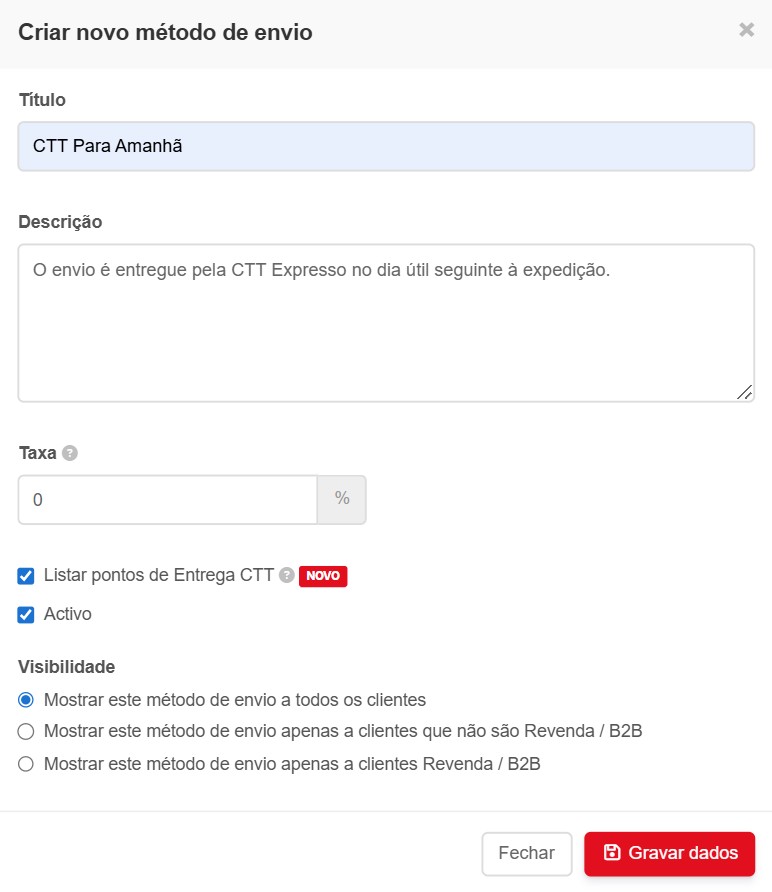 Pode definir que o método de envio é mostrado a todos os clientes, apenas a clientes finais ou a clientes com acesso à área de Revenda.