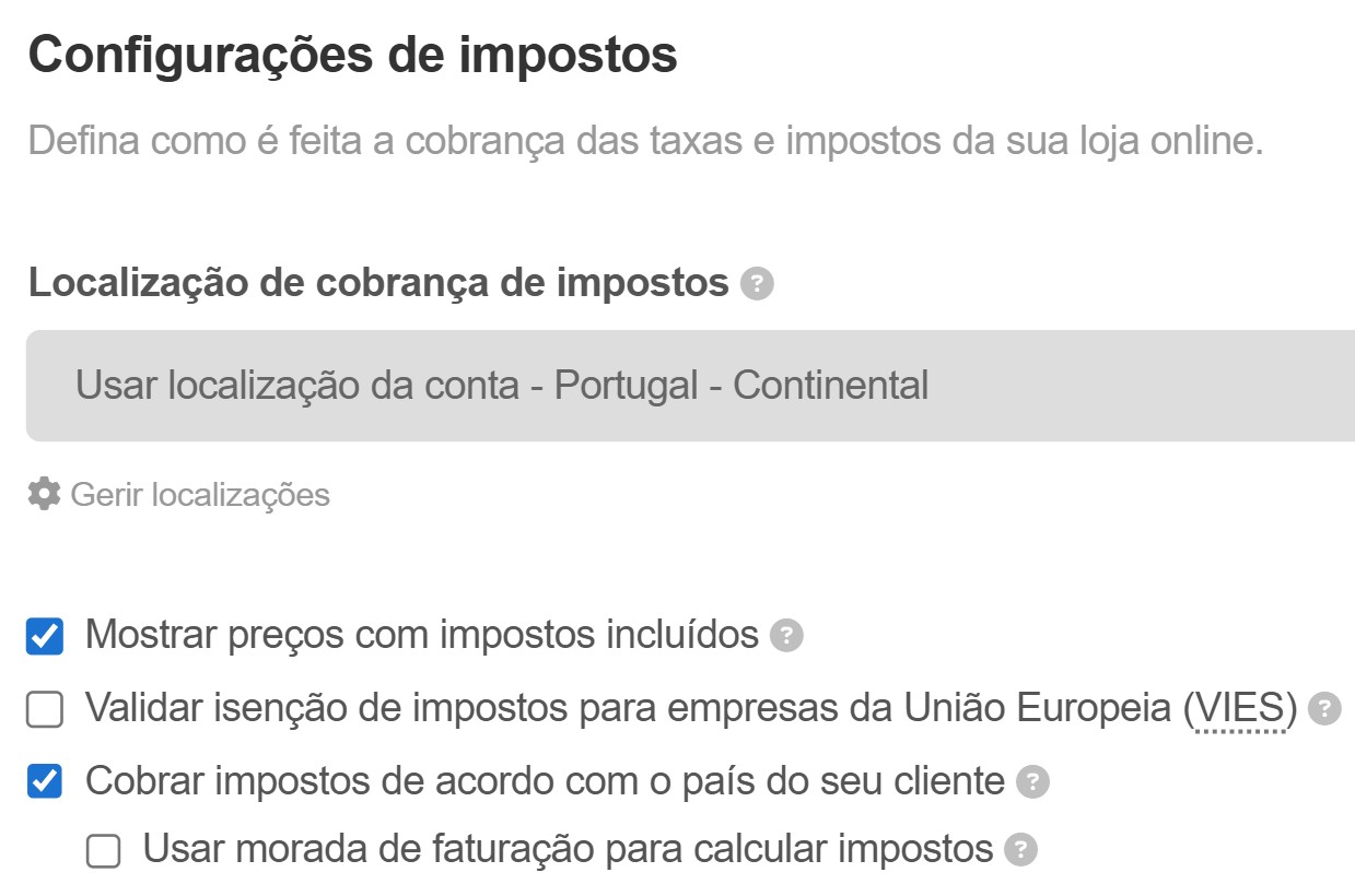 - Pode também definir se pretende cobrar impostos de acordo com o país do seu cliente e se pretende utilizar a morada de faturação para calcular impostos.