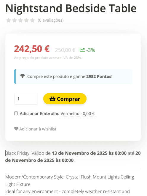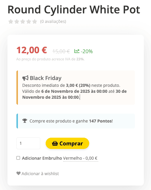 • Caixa de aviso: Cria um destaque visual num bloco dedicado do detalhe do produto, com o nome da campanha, valor do desconto e data de validade. Este destaque surge visível abaixo do preço do produto.