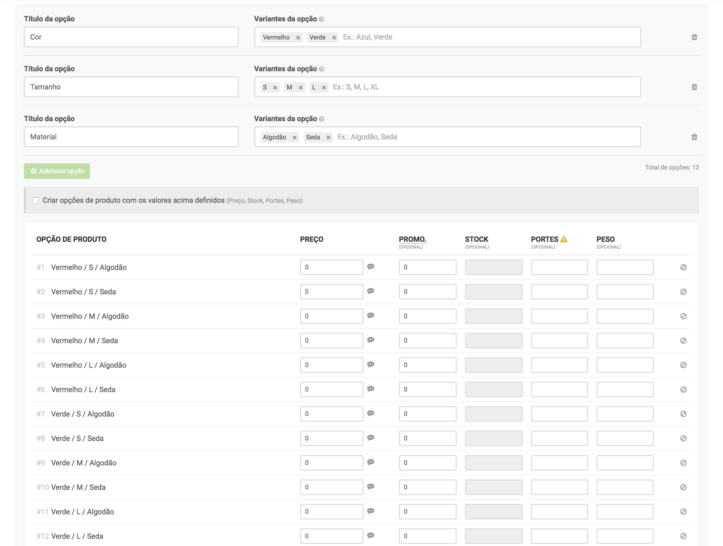 Corresponde ao campo Criar opções de produtos com os mesmos valores acima definidos (Preço, Stock, Portes, Peso).