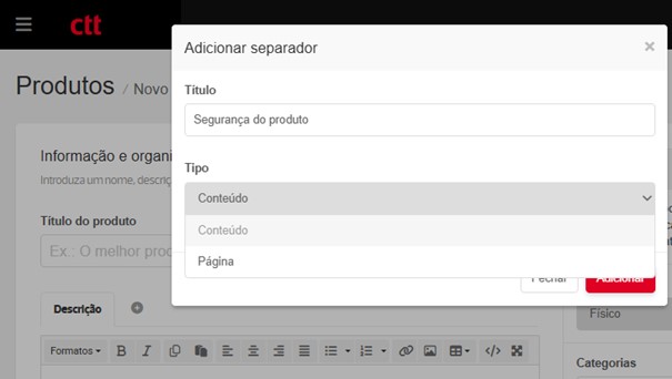 Ao escolher o separador do tipo Página, surge um novo campo onde precisa de selecionar a página que pretende associar ao novo separador da ficha do produto. A página deve estar previamente criada no menu Páginas.