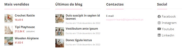 A secção Mais Vendidos, surge no final da homepage e exibe os produtos mais vendidos na loja em geral. Esta secção não é possível de ser configurada ou personalizada, sendo que os produtos irão surgir automaticamente conforme as vendas da loja online.