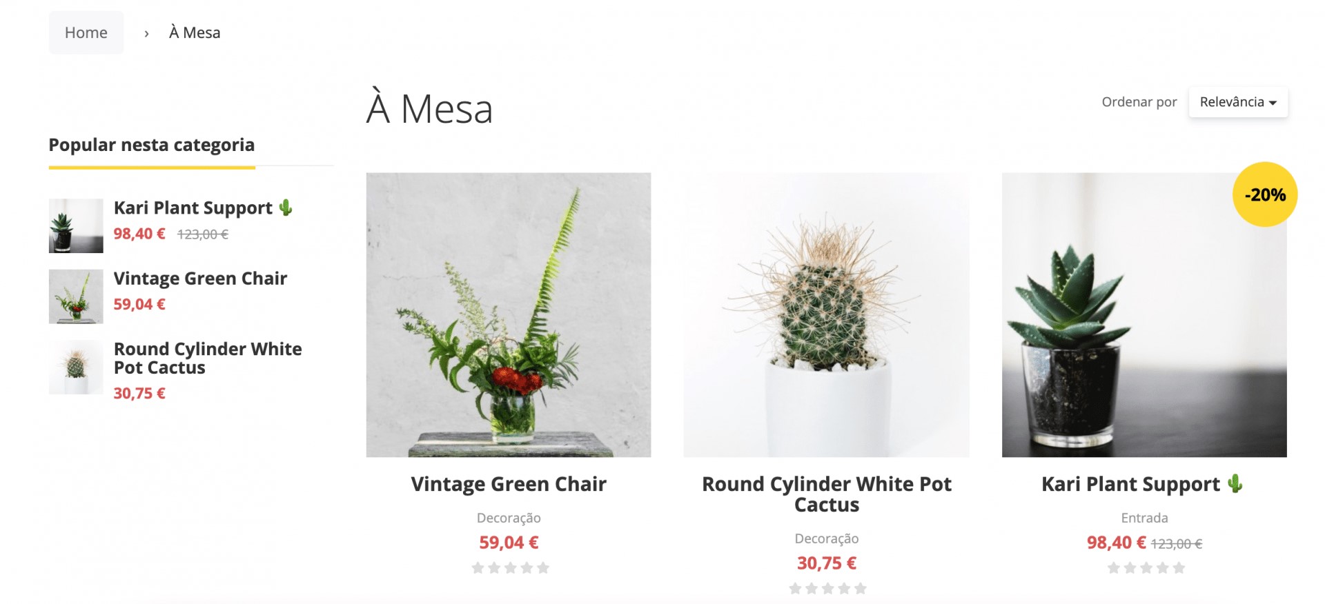 Na secção Popular nesta categoria enquadrada dentro de cada categoria, surgem sempre 3 produtos ordenados pela quantidade de vendas. Caso nenhum dos produtos tenha vendas, surgem os 3 produtos mais antigos dessa categoria.