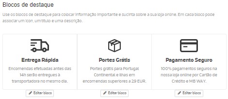 Os blocos de destaque são conjuntos organizados de informação relevante que pode colocar na homepage da loja online.