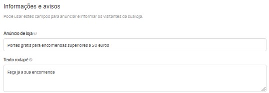 Pode configurar o título do anúncio de loja no menu Configurações / Website na secção Informações e avisos, no campo Anúncio de loja.