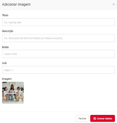 Pode também inserir imagens de campanhas ou promoções e associar umtítulo, descrição, botão e um link.