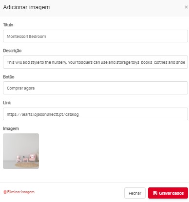 Para imagens alusivas a campanhas de desconto, novidades ou produtos, por exemplo, deve clacar sobre a imagem e utilizar os campos Título, Descrição, Botão e Link. Se pretende adicionar uma imagem genérica sem qualquer texto ou link, basta adicionar a imagem.