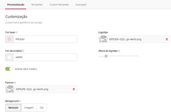 - Background: pode alterar o fundo da loja online adicionando uma imagem, uma cor ou optar por não colocar nenhum background específico.
