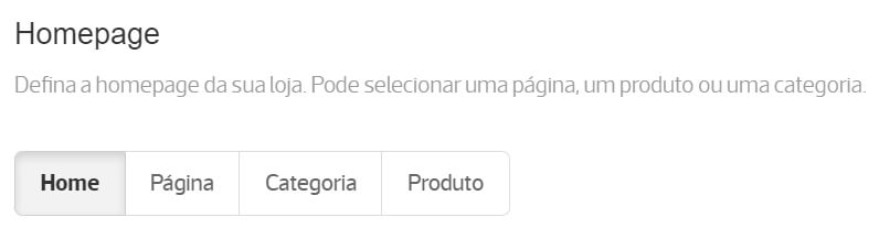 A homepage da loja online pode ser a página Home, uma página nativa (ex. Todas as marcas) ou de conteúdo personalizado, que tenha criado no menu Páginas, uma categoria ou uma página de produto.