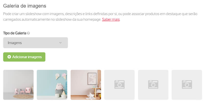 No menu Aparência / Personalização, na secção Galeria de imagens, pode configurar o slideshow da loja online. Pode escolher entre dois tipos de galeria: