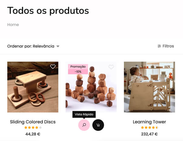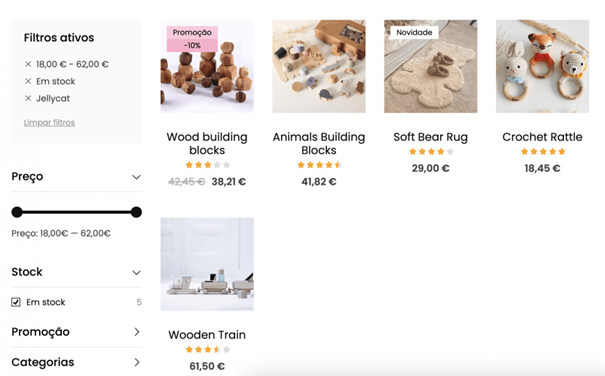 Os filtros de produtos estão disponíveis em todas as páginas da loja com listas de produtos. Existem vários tipos de filtros baseados nas características dos produtos que podem ser aplicados nas listagens: