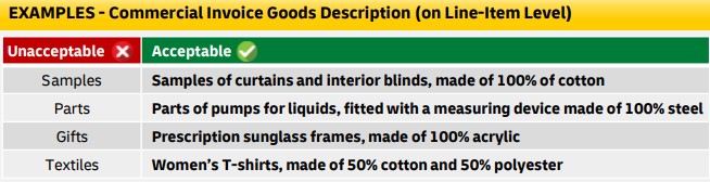 • Descrição dos bens: Descrever claramente as mercadorias ao nível do item (o que é, do que é feito e qual a sua finalidade), de modo a permitir que as autoridades alfandegárias identifiquem mercadorias proibidas/restritas, bem como realizem uma avaliação de risco adequada por motivos de segurança.