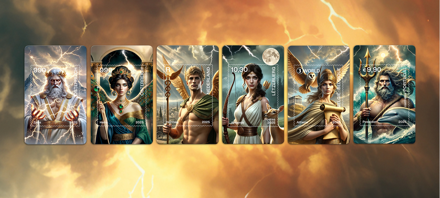This year, we’ve prepared a joint issue dedicated to Greek Mythology. 5 countries, 6 gods, one unique release: Crypto Stamp Poseidon (CTT), Zeus & Hera (Austrian Post), Hermes (PostNL), Artemis (Post Luxembourg), and Athena (bpost).